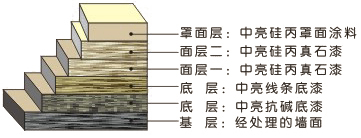 采用彩色天然碎石為主要成份,以特殊防水性硅丙乳液為粘著劑制成的,它完全克服了傳統(tǒng)真石漆耐污性差、附著不牢固、遇雨水沖刷易泛白、陽光照射易泛黃等缺點,經(jīng)過多年的成功應(yīng)用,中亮涂料公司發(fā)現(xiàn)真石漆表面的積灰是影響真石漆裝飾價值的關(guān)鍵所在。為此本公司運用多網(wǎng)狀交聯(lián)反應(yīng)技術(shù),提高涂膜成膜后的致密性,從而降低表面的積灰率,是一種不可多得的耐久型真石漆。 主要適用于: