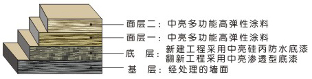 中亮涂料技術(shù)開發(fā)部成功運用架橋技術(shù),采用耐久性優(yōu)越反應(yīng)硬化型水性丙烯酸硅彈性乳液為粘結(jié)劑,使得彈性涂膜具有了光固化的核殼效應(yīng),彈性涂膜還可以隨著墻壁的龜裂而伸縮,不論新建工程還是改裝返修工程,本產(chǎn)品都可以良好的起到墻面抗裂和防水作用。從而實現(xiàn)了集高彈性、防水、耐污染、防潮、防霉及高耐久等多種功能于一體的高彈性涂料。 主要適用于: