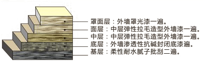 采用核殼型丙烯酸高彈性合成樹脂和特殊的丙烯酸樹脂配制成的彈性厚質(zhì)涂料,是一種延伸性抗裂,抗老化的優(yōu)質(zhì)彈性中層涂料,采用專用拉毛滾筒使涂料造型細(xì),中,粗不同的桔皮紋點(diǎn)子,使涂料造型質(zhì)感美觀具有立體感,主要用在需造型涂料中層面,所稱拉毛造型中型涂料,它具有高彈性功能,可覆蓋出現(xiàn)嚴(yán)重裂縫的新舊墻面,因彈性涂料有一定的百度,有效防止墻面開裂所產(chǎn)生的裂縫。 主要適用: